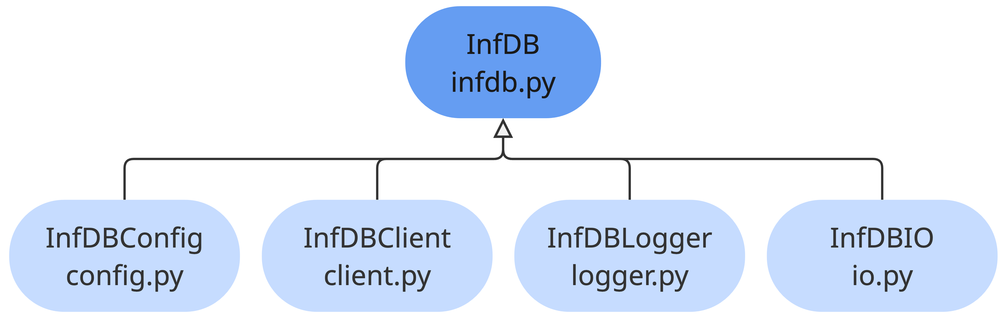 The user only interacts with the superior InfDB class, the internal classes are not directly accessible. This abstraction ensures the python interface is consistent despite changes in the internal structure of the package.